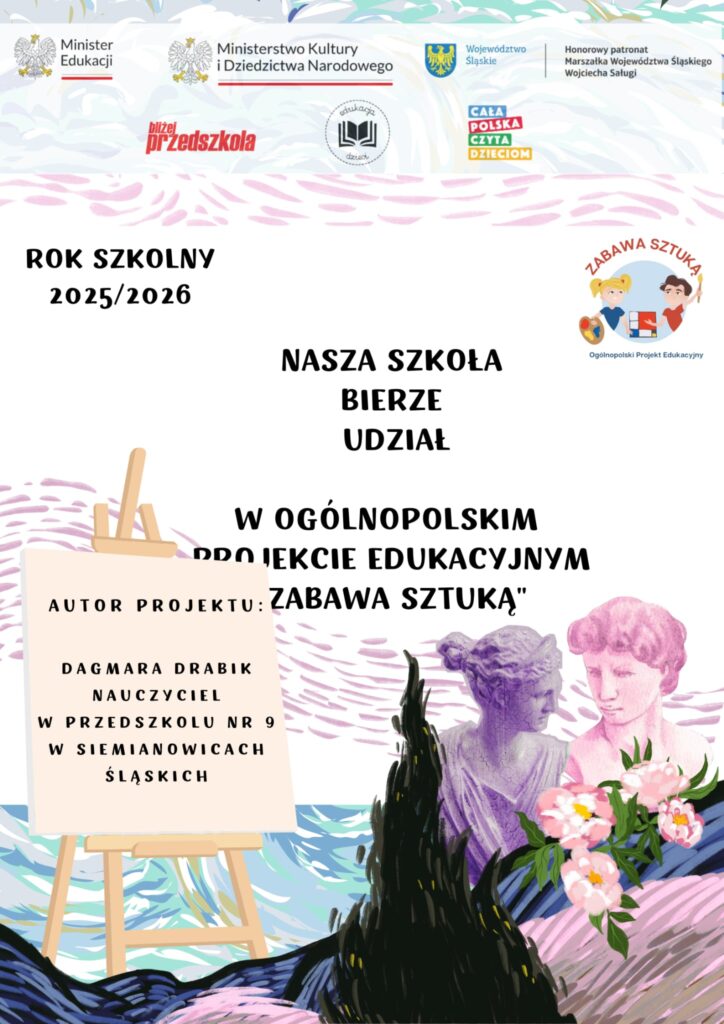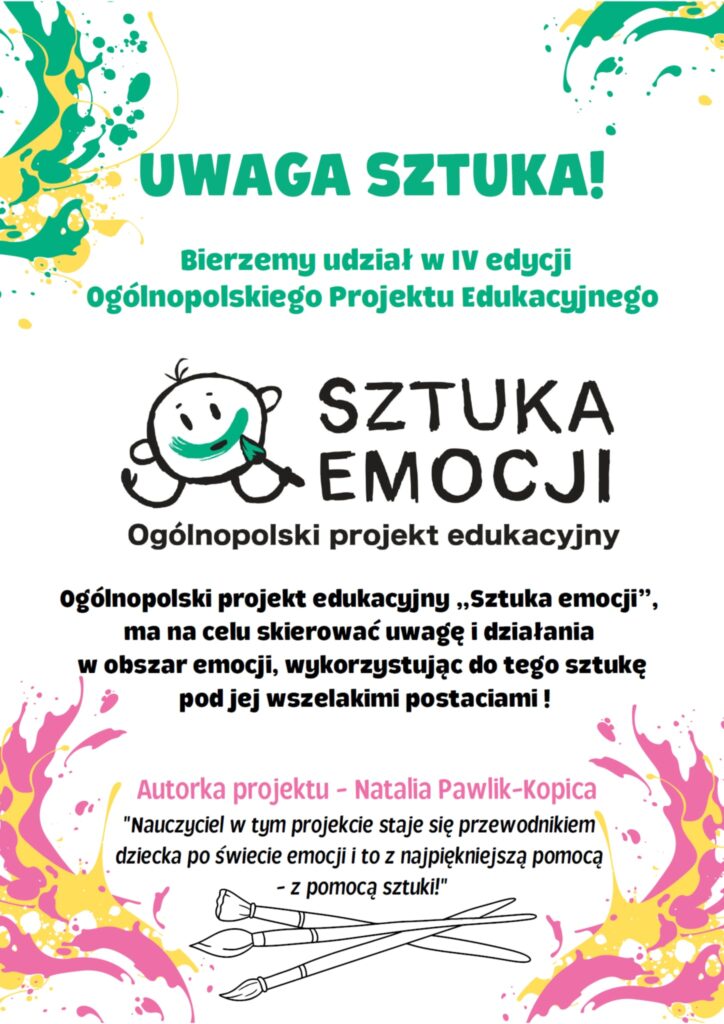 Ogólnopolski Projekt Edukacyjny „Zabawa sztuką” to połączenie zabawy, sztuki i nauki. Głównym celem projektu jest propagowanie sztuki w korelacji z kompetencjami kluczowymi oraz zgodnie z założeniami pedagogiki freblowskiej. Bohaterowie Leo i Lisa ponownie zabiorą dzieci w świat sztuki. Skąd pomysł na ich imiona? Leo nawiązuje do Leonardo da Vinci. Lisa to odwołanie do obrazu Mona Lisa. Należy dodać, że sztuka jest niesamowicie terapeutyczna, uczy wrażliwości, innego spojrzenia na świat, a często nawet współpracy. W naszej szkole projekt jest realizowany od września do kwietnia w oddziale przedszkolnym i klasach I-VIII.